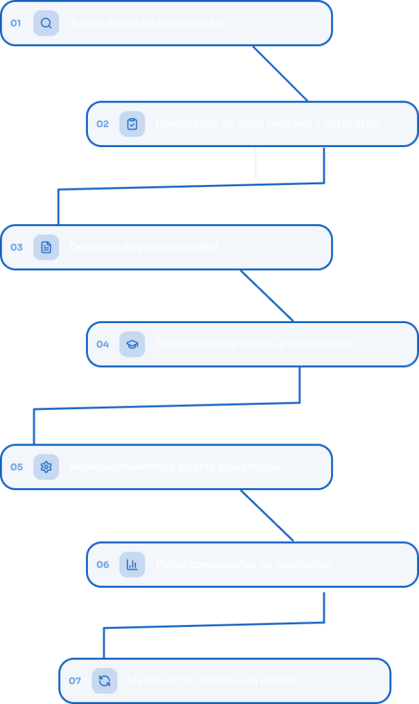 A Klinzza atua dentro da rotina real do cliente. A gente avalia fluxo, define protocolo, treina equipe e acompanha parâmetros para manter segurança e continuidade operacional. Isso vale tanto para operações únicas quanto para redes que precisam de padronização entre unidades.